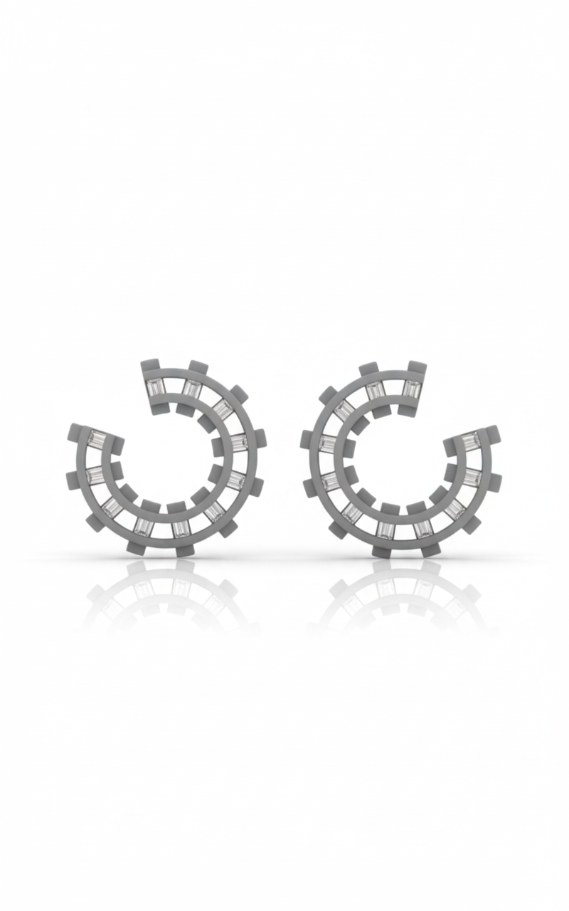 Architectural Railroad Diamond Loop earring design CAD Study is presented as a statement earring design prepared for CAD modeling, 3D jewelry development, and production planning. This CAD direction is shaped for jewelry development discussions where design character and manufacturability both matter.