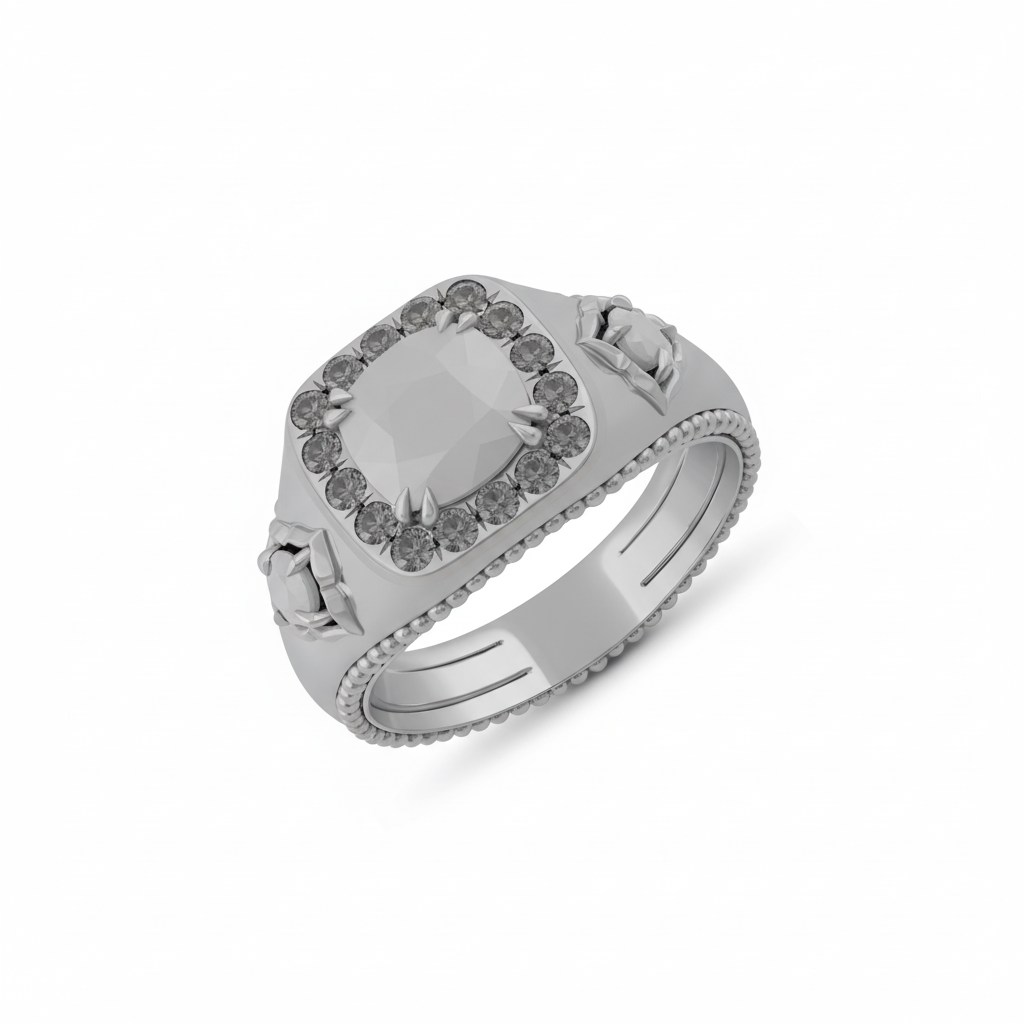 Within our curated design archive, this sophisticated digital model functions as a definitive visual benchmark for advanced custom jewelry development. Beyond a mere presentation of a finished piece, this CAD design page elucidates the methodological process by which similar complex geometric and sculptural directions can be meticulously adapted and engineered into a unique custom-manufactured ring, leveraging client-provided conceptual sketches, photographic references, or precise technical specifications. Our expertise in 3D modeling and production planning ensures a seamless transition from concept to tangible heirloom.