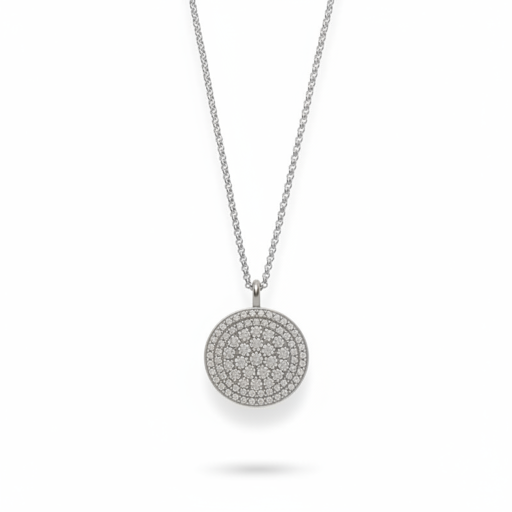 This CAD rendering showcases a modern pendant, meticulously designed with a striking pavé diamond arrangement. The intricate 3D modeling ensures a harmonious balance of form and brilliance, allowing for versatile integration into layered compositions or as a singular, refined focal point.