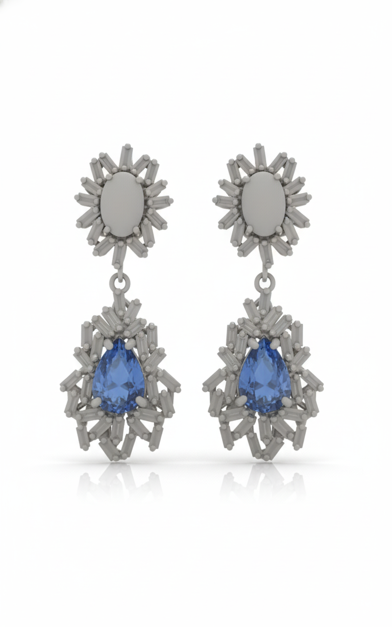 This meticulously developed CAD model showcases a breathtaking statement drop earring design, featuring a harmonious assembly of brilliant diamonds, profound sapphires, and mesmerizing opals. Engineered for prominent aesthetic impact, this exceptional jewelry design effortlessly transitions from sophisticated daytime wear to glamorous evening adornments, embodying a unique fusion of material science and artistic vision.