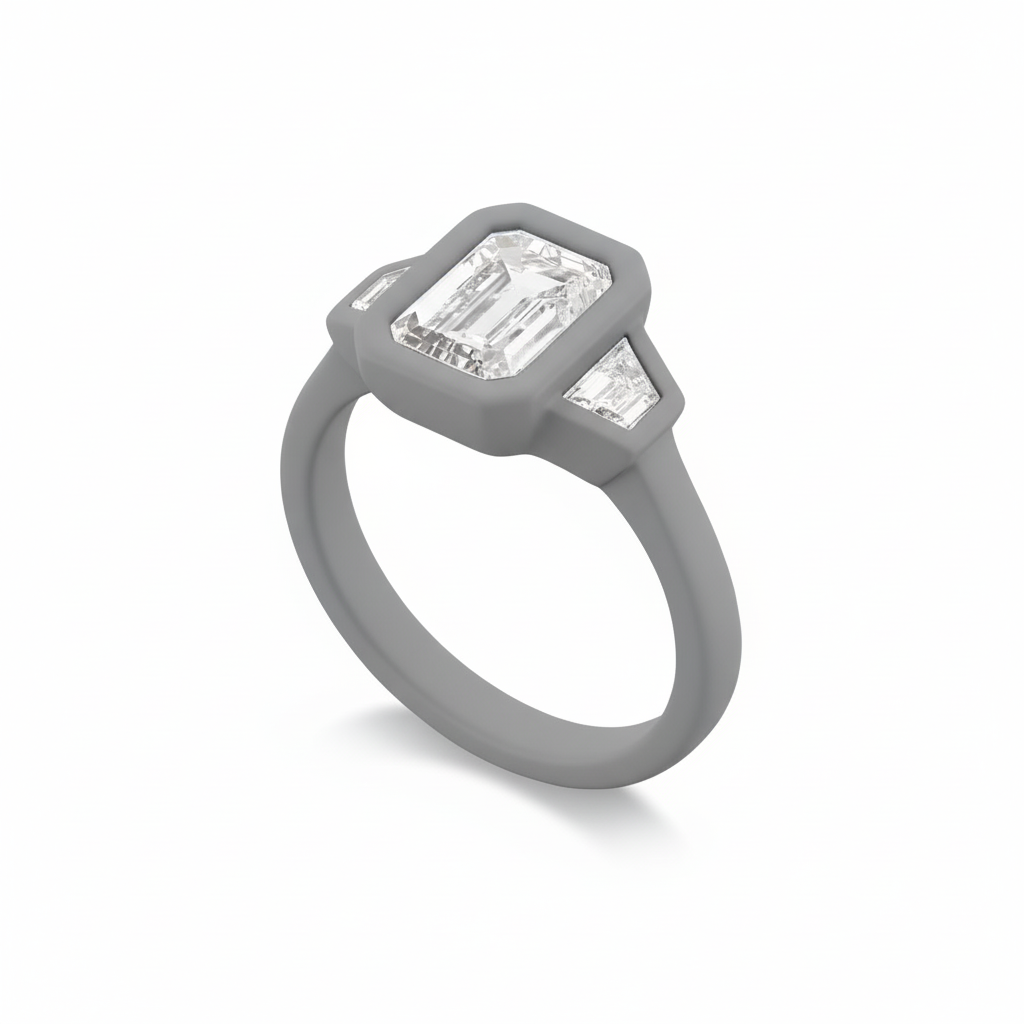 This intricate ring CAD model, featuring a prominent North-South emerald-cut gemstone flanked by precision-set trapezoidal diamonds, serves as an exemplary reference for advanced 3D modeling and precision engineering in bespoke jewelry production.