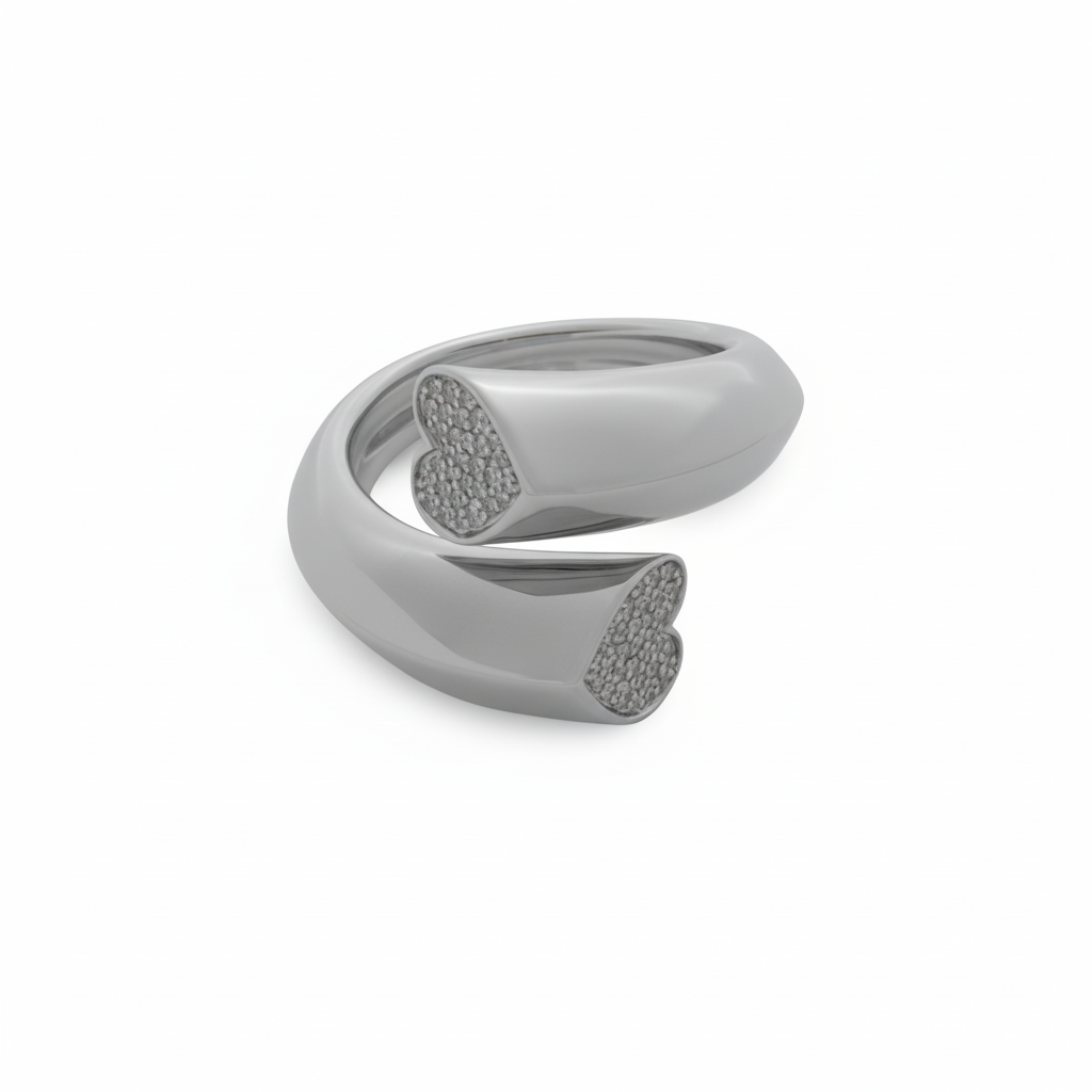 An advanced CAD rendering showcasing an intricate interlocking heart motif, meticulously designed for bespoke jewelry production. This digital blueprint facilitates precision manufacturing of a pavé-set statement ring in a radiant golden alloy.