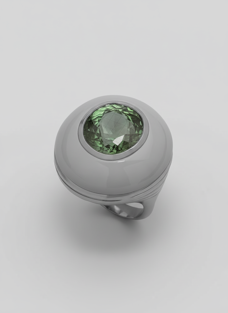 This CAD-engineered representation of a vintage gold ring, adorned with green tourmaline and pink opal, is preserved within our design gallery as an illustrative benchmark for custom jewelry development. The purpose of this exhibit is to demonstrate the adaptability of its intricate structural and aesthetic elements. Utilizing advanced 3D modeling and engineering techniques, a similar design direction can be precisely translated into a unique, custom-fabricated ring, derived from conceptual sketches, inspirational imagery, or explicit client-specific design parameters.