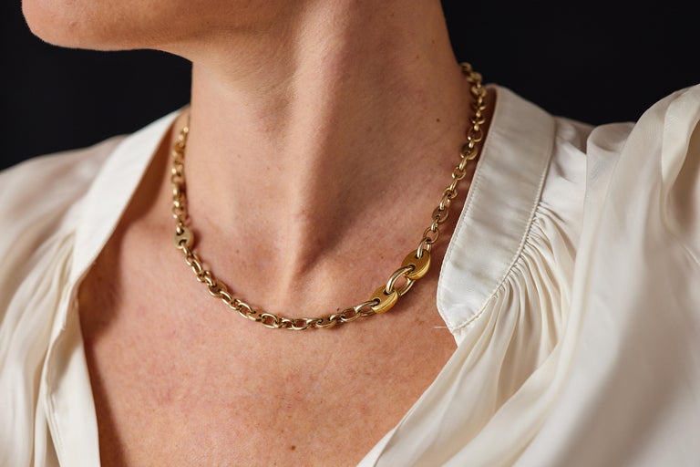 We keep Pomellato 18k Gold Mariner Chain Necklace, Early 1970s, 49.8g in the gallery as a visual benchmark for custom development. Rather than treating it as a retail listing, the page explains how a similar direction can be adapted into a custom-made necklace based on sketches, photos, or client-specific requirements.